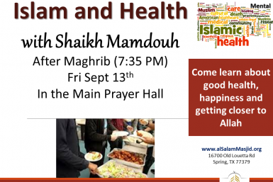 WHEN: Friday, Sep 13th, after Maghreb (7:35 PM) WHERE: Main prayer hall TEACHER: Shaikh Mamdouh Come learn about good health, happiness, and getting closer to Allah SWT Dinner will be served after Isha