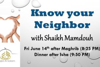 WHEN: Friday, June 14th, after Maghrib (8:25 PM) WHERE: Main prayer hall SPEAKER: Shaikh Mamdouh Dinner will be served after Isha (9:50 PM)