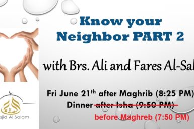 WHEN: Friday, June 21st, after Maghrib (8:25 PM) WHERE: Main prayer hall SPEAKER: Brs. Ali and Fares Al_Salim Dinner will be served BEFORE Maghreb at 7:50 PM