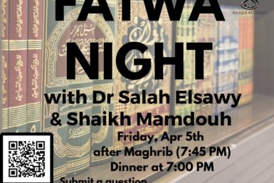 WHEN: Friday, April 5th, after Maghreb (7:45 PM) WHERE: Main prayer hall SPEAKER: Dr. Salah Elsawy & Shaikh Mamdouh Please send any questions to the Shaikh using THIS ONLINE FORM. Program will be live streamed on Facebook Please note that Dinner will be served BEFORE Maghreb, at 7:00 PM