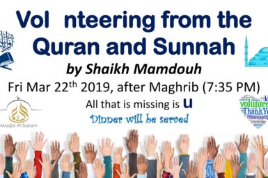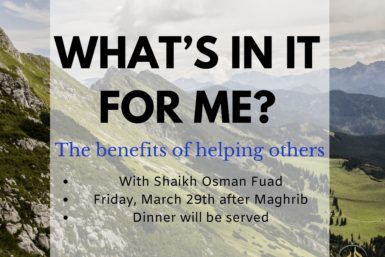 WHEN: Friday, April 5th, after Maghreb (7:45 PM) WHERE: Main prayer hall SPEAKER: Dr. Salah Elsawy & Shaikh Mamdouh Please send any questions to the Shaikh using THIS ONLINE FORM. Program will be live streamed on Facebook Please note that Dinner will be served BEFORE Maghreb, at 7:00 PM