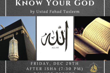 WHEN: Friday, Dec 29th, after Isha WHERE: Main prayer hall SPEAKER: Ustadh Fahad Tasleem Dinner will be served