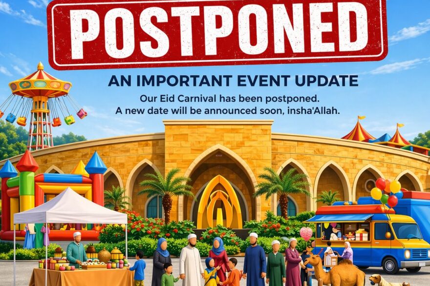 POSTPONED DUE TO RAIN FORECAST Our 2026 Eid Carnival has been postponed due to changing weather forecast, and it will not be taking place on Saturday, April 25. The new date is not finalized yet, but it will be announced soon, insha’Allah. We’re still Read More …