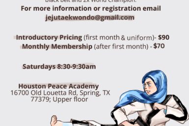 WHEN: Saturdays | 8:30 – 9:30 AM WHERE: Houston Peace Academy – Upper Floor TO REGISTER: Email [email protected] Open to ladies only Monthly Fee: $70 (plus a one-time fee of $20 for uniform) Taught by Mrs/ Nguyen: 4th degree Black Belt and 2 times ITF World Champion