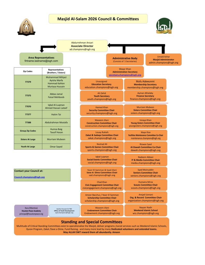 Contact information about the council members and committee is available in the Masjid Directory page.