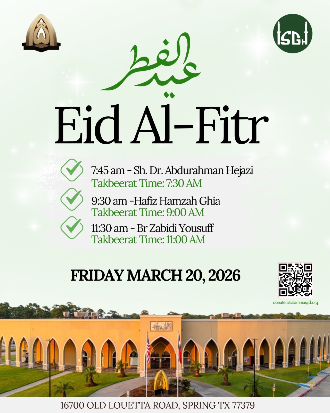 Useful things to know for those attending the Eid prayers at Masjid AlSalam located at 16700 Old Louetta Road, Spring, TX 77379: