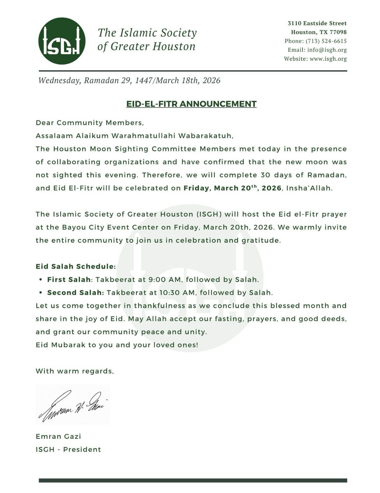 • The official ISGH announcement can be viewed here: Eid announcement