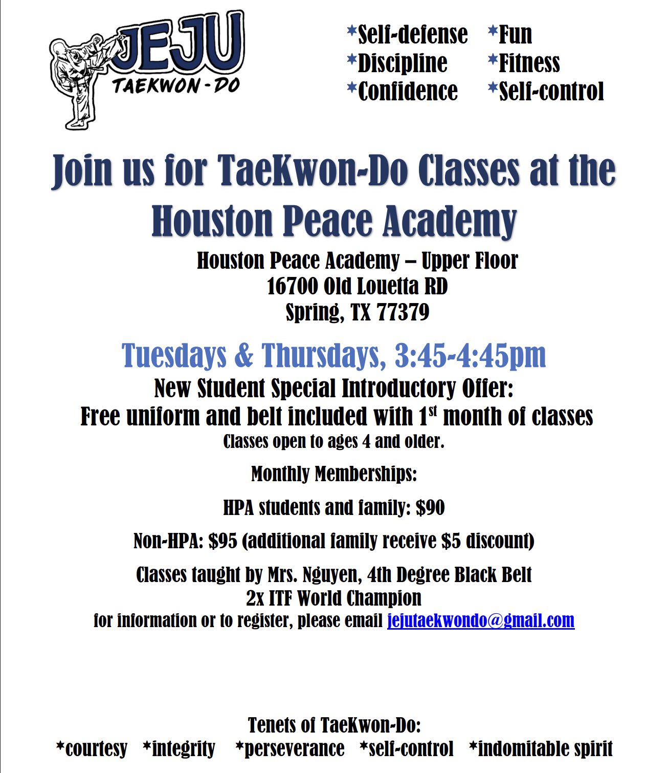 - Taught by Mrs/ Nguyen: 4th degree Black Belt and 2 times ITF World Champion