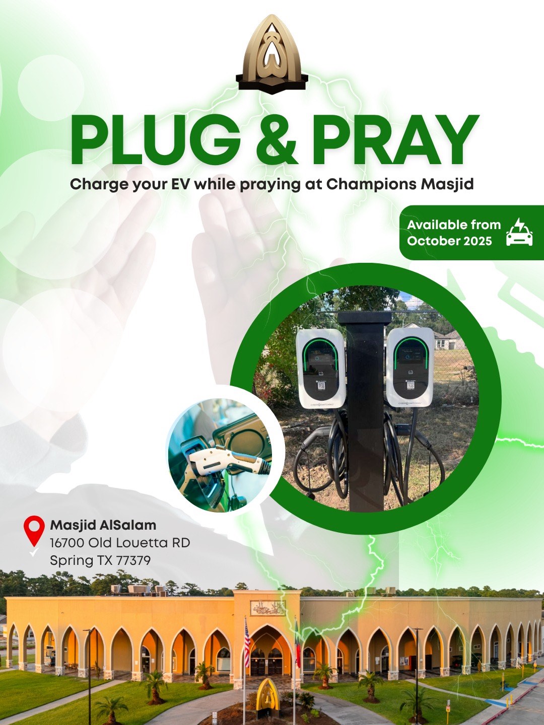 We are pleased to inform visitors with electric cars that they can utilize the newly installed EV Charging Stations for charging their cars during their visit to the masjid.