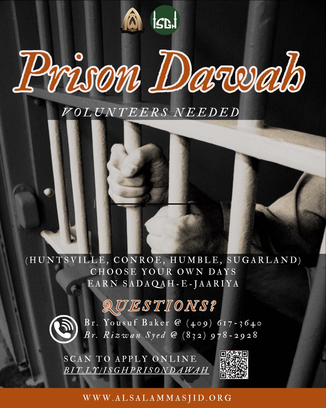 The ISGH Prison Dawah team at Masjid AlSalam is looking for volunteers to expand its reach and better serve the inmate community in the Greater Houston area. If you are able to help in this noble effort and earn sadaqa-e-jaariya please contact the names shown below AND apply online to register with the Volunteer Services Program at the Texas Rehabilitation Programs Division.