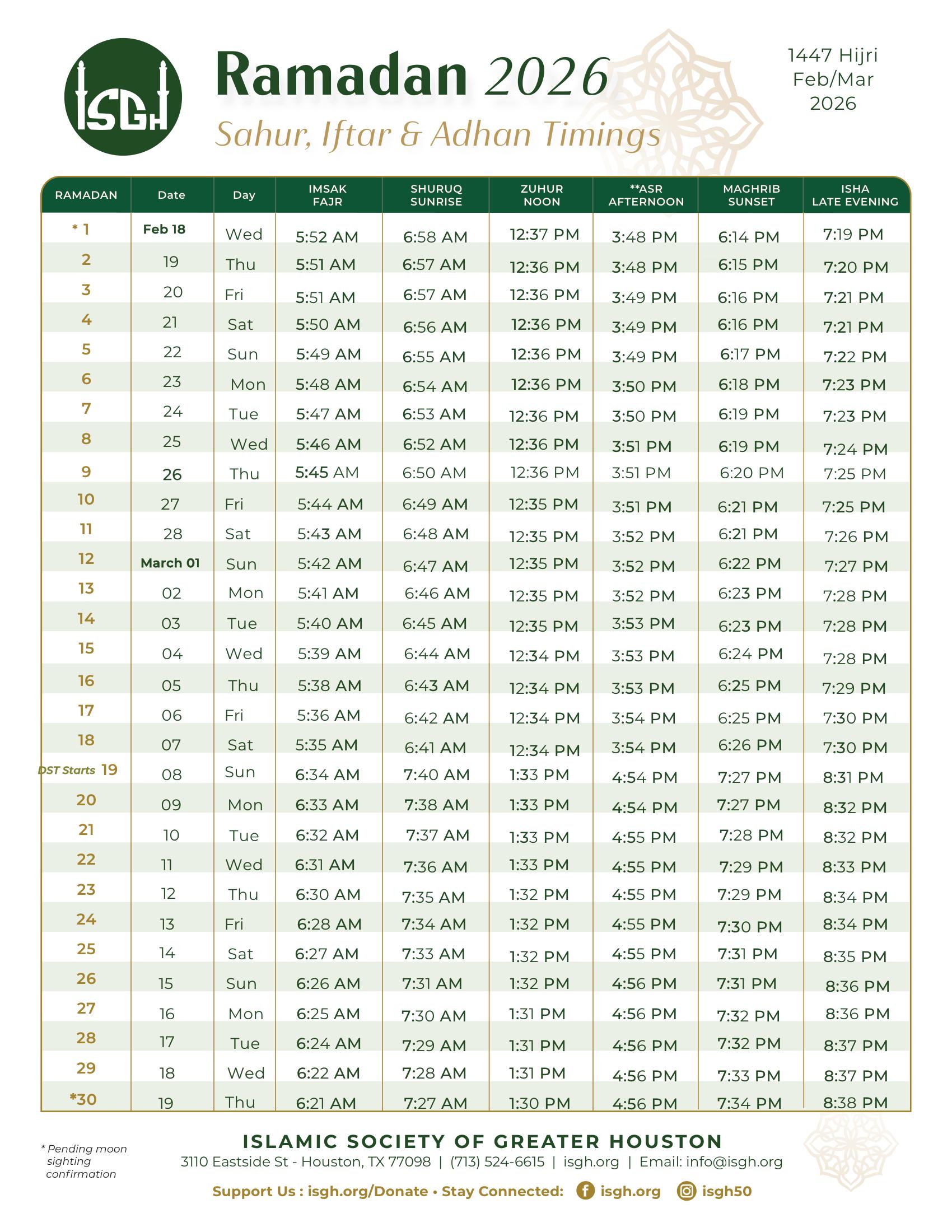 The Houston Moon Sighting Committee, which includes Imams and Scholars of various Islamic Centers and Organizations in the Houston area will meet on the evening of Tuesday, February 17th, the 29th of Shabaan to verify moon sighting reports and based on their information they will declare whether Wednesday, Feb 18th, or Thursday, Feb 19th will be the first day of fasting for this Ramadan.