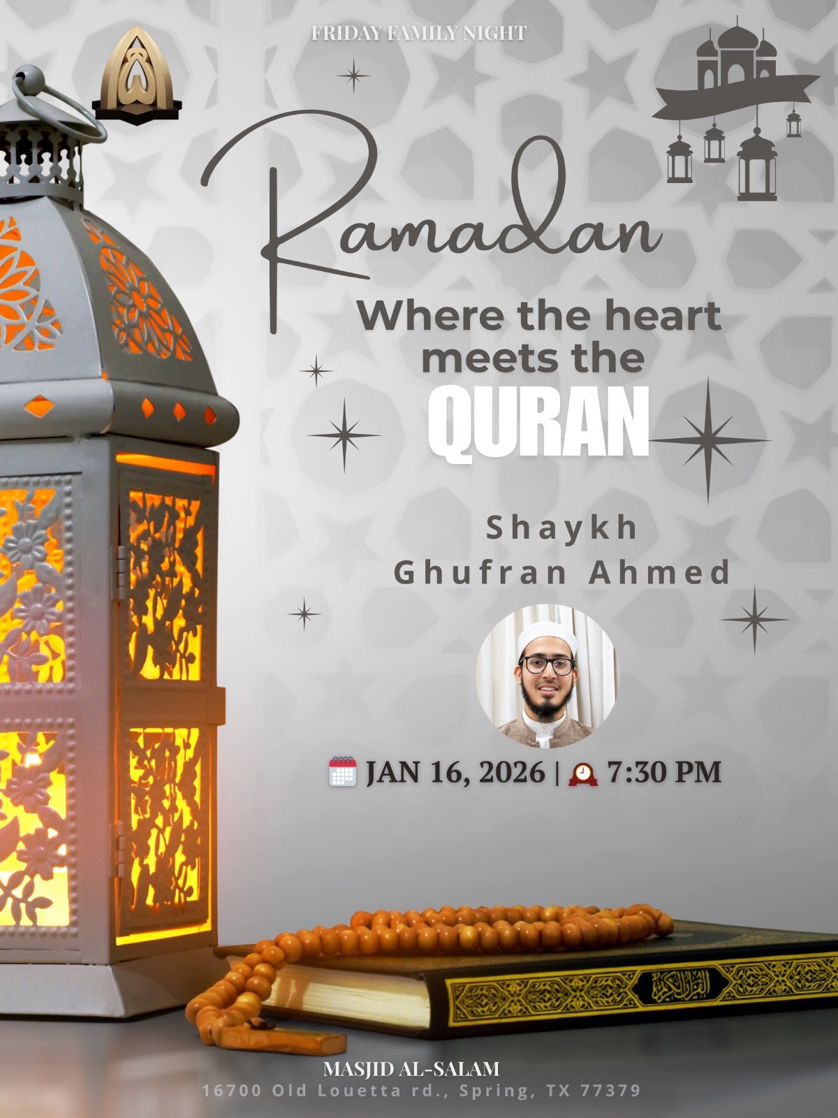 Ramadan – where the Heart meets the Quran Posted onJanuary 15, 2026January 16, 2026Authoradministrator WHEN: Friday, Jan 16th, 2026 | after Isha (7:30 PM) WHERE: Main prayer hall SPEAKER: Shaykh Ghufran Ahmed A Family Friday Night program FacebookTwitteremail