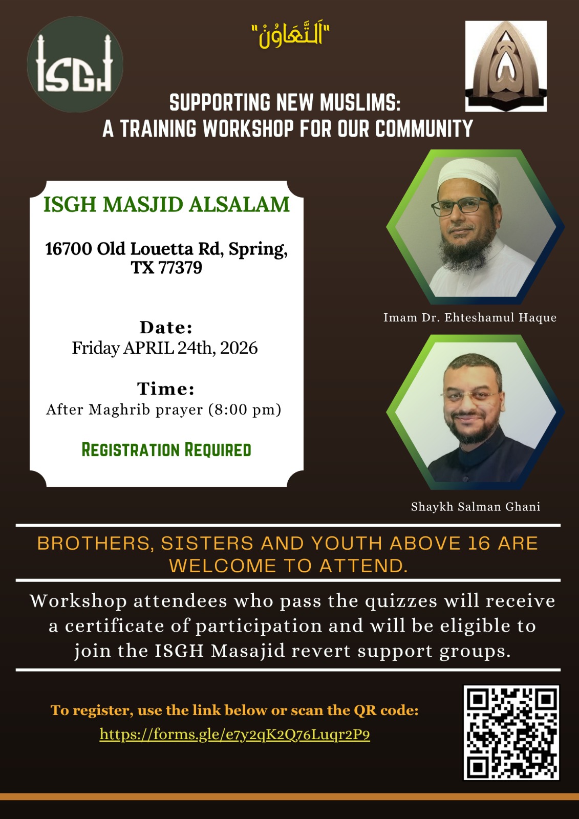 Join us for the “At-Ta’aa-wun” Workshop — a dynamic 1.5-hour session focused on da’wah and how to support reverts in their first steps after shahadah.